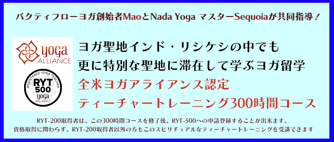※既にRYT200を取得済み(200時間修了者)の方で、本ティーチャートレーニング300時間修了した後に、100時間の指導実績を経て、全米ヨガアライアンス認定RTY500へのアップグレード申請登録することができます。